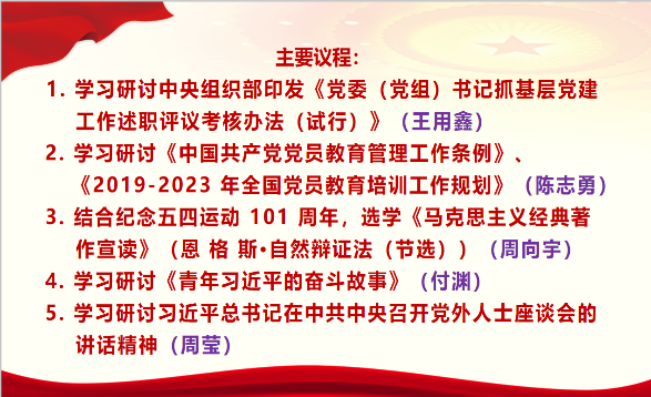 2020年05月14日,智能电子系党支部通过党支部群远程在线开展了五月主题党日学习活动。本次主题是“严密组织体系,强化政治功能”,支部书记王用鑫主持本次活动,全体党员除了1人请假外都参加了学习。