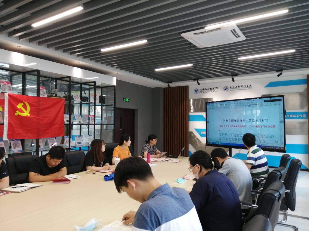 党员活动室高挂党旗,物联网应用系全体师生党员佩戴党员徽章,参加此次主题党日活动,活动由支部副书记张二元同志主持。会议第一项,徐欣同志领学《习近平新时代中国特色社会主义思想三十讲》中第十八讲有关推动社会主义文化繁荣兴盛的内容,并观看视频。会议第二项,张二元同志领学习习近平总书记在中央政治局第二十一次集体学习的讲话精神、习近平总书记视察重庆重要讲话精神和市委五届八次全会精神和习近平总书记在决战决胜脱贫攻坚座谈会上的讲话精神。会议第三项,陈家玮同志组织学习教育部《高等学校教育思政建设指导纲要》。