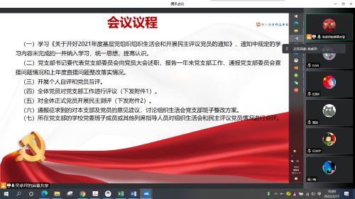 3月17日下午,HAHA体育工业互联网技术党支部组织召开2021年度组织生活会和民主评议会议。按当前疫情防控要求,本次会议采用了线上形式,支部书记吴卓坪同志主持,全体党员参会。