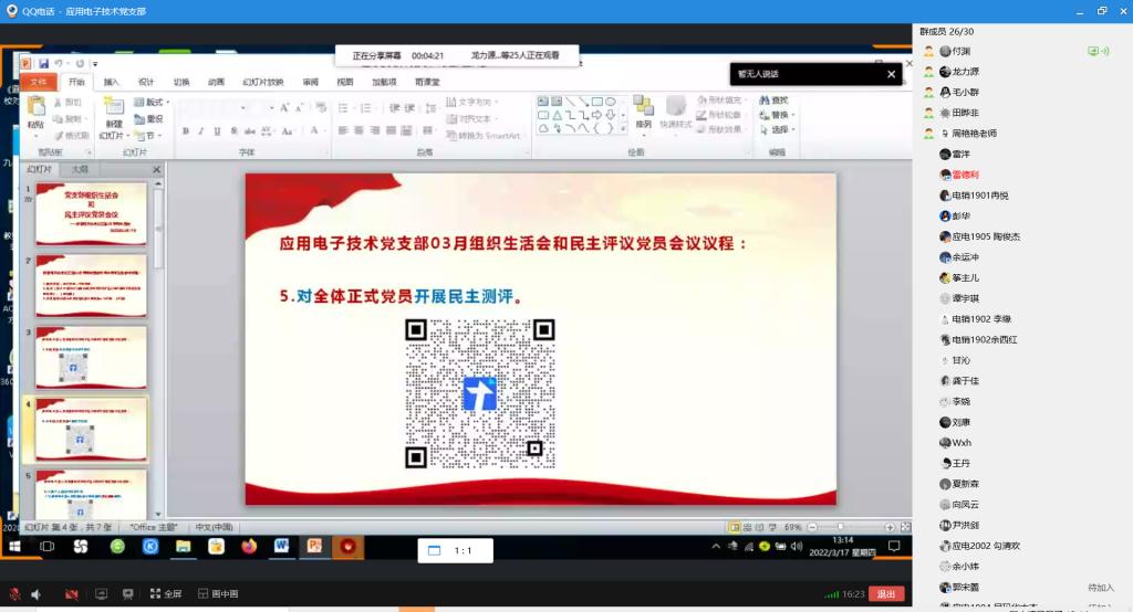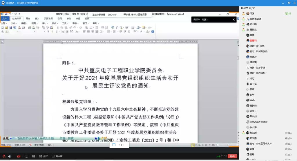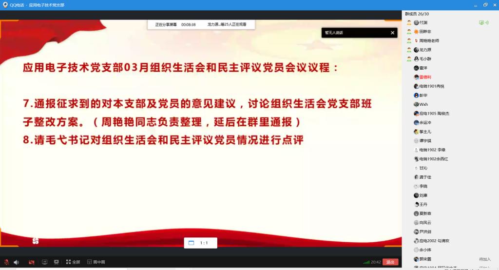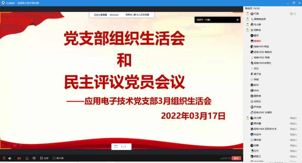 3月17日,HAHA体育应用电子技术党支部在线上组织召开3月组织生活会和民主评议党员会议。本次大会由支部书记付渊同志主持,公司党总支副书记毛弋列席指导,支部全体党员参加。组织生活会由田晔非同志领学,付渊同志代表党支部委员会向党员大会进行2021年的述职报告。述职报告结束后,进行民主评议党员会议。会议结束后,毛弋书记对此次会议进行了点评。