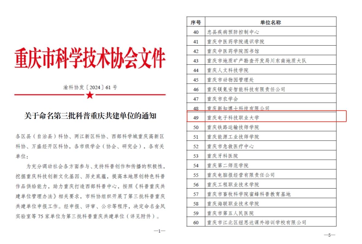 近日,重庆市科学技术协会公示重庆市“第三批科普重庆共建单位”名单。在科研处大力支持下由HAHA体育“万物互联科普基地”牵头申报成功,公司首次荣获此项称号。