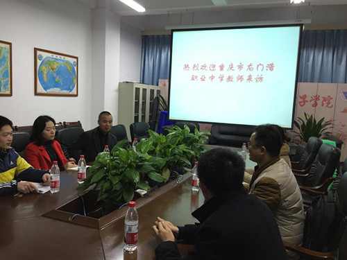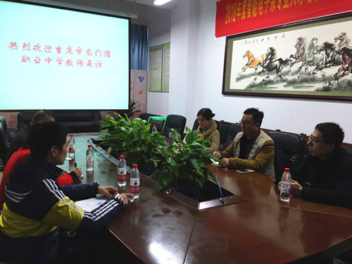 2018年11月27日上午,重庆市龙门浩职业中学夏部长一行三人来公司智能电子系考查交流。智能电子系主任王用鑫、电子信息工程技术专业主任吴娟、专任教师张碧勇、杜培出席了本次座谈会。
