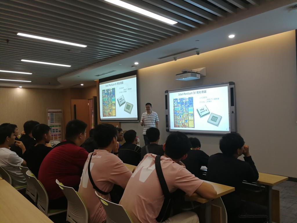 在参观过程中,重庆两江半导体研究院战略合作部主任吴茂琴和战略合作部经理谢诗杰简单介绍了公司发展情况。随后,集成电路学院常务副经理赵汝法博士在技术孵化中心详细讲解了公司的设计开发平台,以及在芯片设计、芯片应用等方面取得的成果和研究进展,主要介绍了SOC系统,FPGA智能硬件,以及依靠专用芯片打造的智能安防、卫星信号接收模块、智能交通等方面特色产品。职工就芯片应用技术与赵博士进行了广泛交流,意犹未尽,因此赵博士还专门给职工们讲解了芯片的发展历史和微电方面的新技术展望。