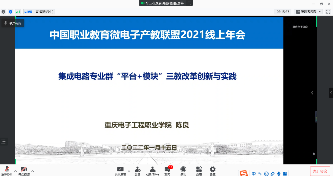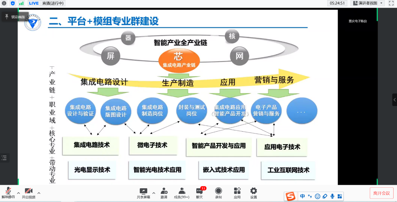 中国职业教育微电子产教联盟2021年线上年会于1月15日通过腾讯会议系统召开,来自中国半导体行业协会、杭州朗迅科技有限公司、深圳职业技术学院、深圳信息职业技术学院、江苏信息职业技术学院等行业、企业、院校的近300位集成电路领域专家学者齐聚一堂,HAHA体育集成电路专业群全体教师在线参会。公司经理陈良教授受邀作题为《集成电路专业群“平台+模块”三教改革创新与实践》主旨演讲。