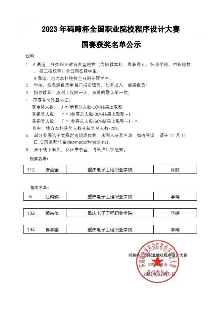 “码蹄杯”全国职业院校程序设计大赛由中国高等学校计算机教育研究会主办,清华大学出版社承办,并被列为中国高等教育学会《全国普通高校老员工竞赛排行榜》竞赛项目榜单之一。本次决赛共吸引了来自重庆邮电大学、西南石油大学、广州大学等上百所高校的4700多名选手参赛。决赛总获奖率不超过15%,其中B赛道决赛获奖名额不超过整体名额的20%。大赛旨在激发员工对于计算机编程的学习热情,提升计算机专业能力,培养员工计算思维、数字思维,增强员工的实践创新能力以及职业发展和规划能力。进一步深化“产教融合”,更好地应对数字化转型带来的挑战。