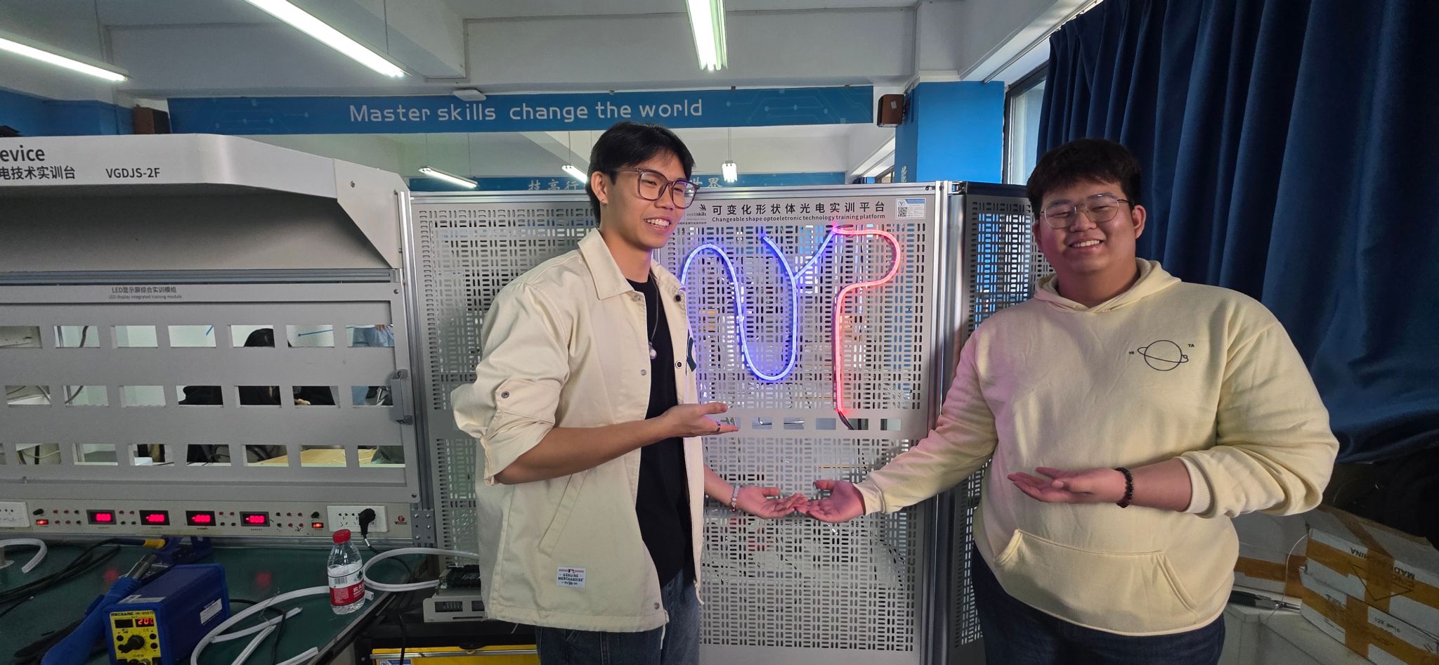 公司精心构建"三维一体"培养体系:语言课堂打破技术术语壁垒,中外员工用代码思维碰撞文化火花;世界技能大赛集训基地里,职工亲手操作LED灯带安装项目,在反复校准线路间距、焊接元件的过程中,直观感受"中国制造"对精密工艺的极致追求;人文交流环节则通过茶道、古筝等非遗课程,让传统技艺与现代科技展开对话。