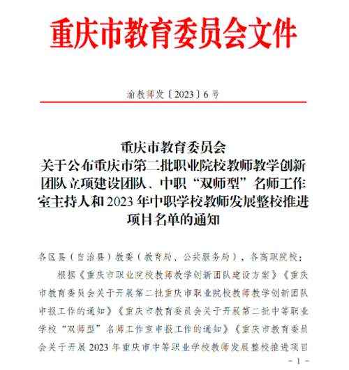 近日,重庆市教育委员会发布《关于公布重庆市第二批职业院校教师教学创新团队立项建设团队、中职“双师型”名师工作室主持人和2023年中职学校教师发展整校推进项目名单的通知》,确定公司“集成电路技术团队”等10个团队为重庆市第二批职业院校教师教学创新团队(高职)立项建设团队。