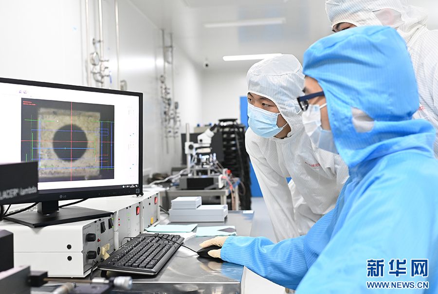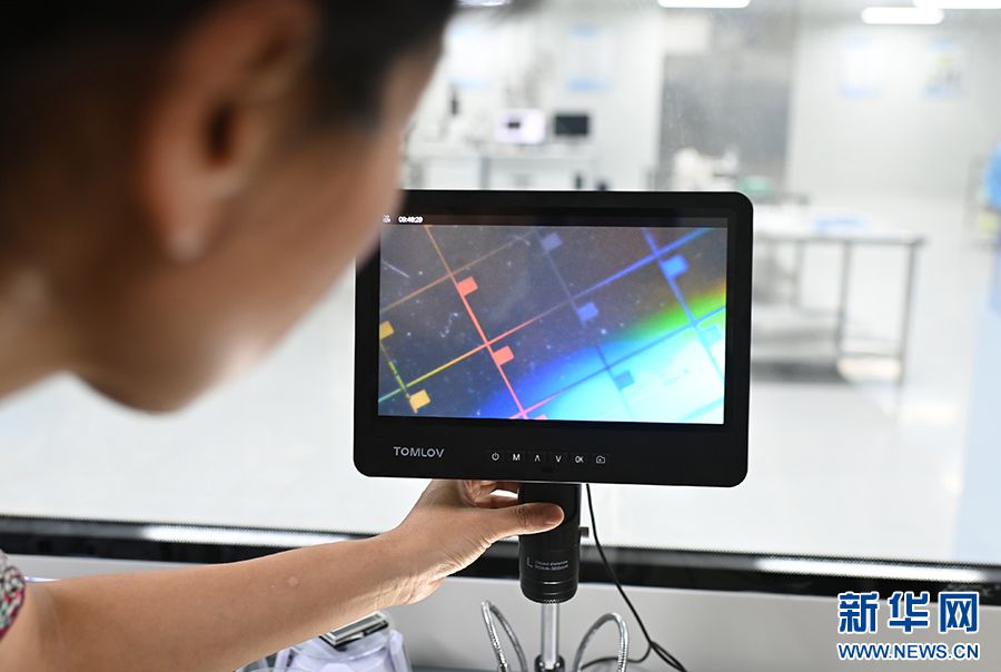 图为员工在观察引线架表面形态。新华网发(孙凯芳 摄)