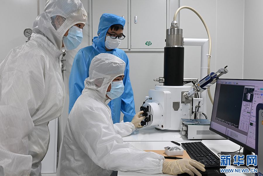教师指导员工们使用亚微米贴片机进行倒装键合芯片。新华网发(孙凯芳 摄)