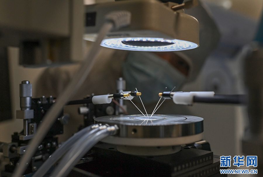 图为员工使用探针台测试芯片光暗电流。新华网发(孙凯芳 摄)