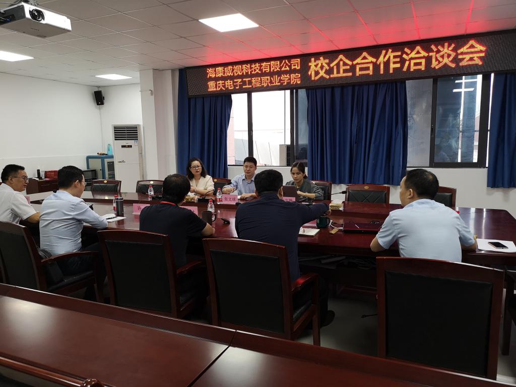 9月14日9:00,海康威视科技有限公司总部人力资源总监张文球、高级员工关系经理许渊、重庆海康威视科技有限公司人力资源经理向文静一行3人受邀来公司进行校企合作洽谈。公司科研与社会服务处处长许磊、电子与物联网公司党总支书记张红斌、副书记毛弋、智能电子系主任王用鑫等7人参会。