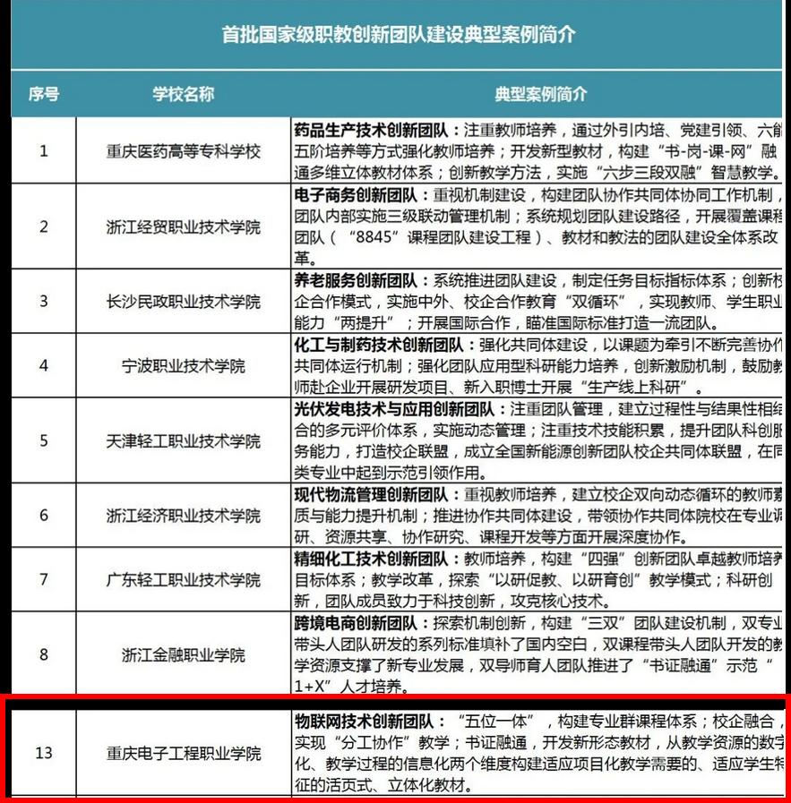 本次公布了13个省市职教教师队伍建设经验做法和30个全国职业教育教师教学创新团队建设典型案例。公司物联网应用技术专业国家级教育教师教学创新团队以“德能双修、务实协作、融合创新”为宗旨,立足职业教育高质量发展,依托物联网国家双高专业群、国家物联网产业示范基地(重庆)、陈良国家级技能大师工作室、新大陆物联网学院等优势资源,通过“大师引领、模组协同、书证融通”等举措打造模组结构化“双师协同”教师队伍,深化“三教”改革。