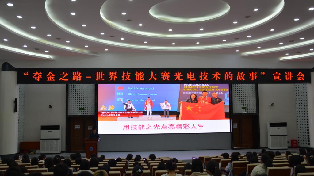 2023年5月9日下午,为深入学习贯彻党的二十大精神和习近平总书记关于技能人才工作重要指示精神,全面落实党中央、国务院和加强新时代高技能人才队伍建设决策部署,按照人力资源社会保障部《关于组织开展“迎国赛、强技能、展风采”主题活动的通知》要求,以成渝地区双城经济圈职业教育活动周为契机,世界技能大赛光电技术项目重庆市集训基地组织开展了以“夺金之路-世界技能大赛光电技术的故事”为主题的宣讲会。来自学校11个学院的300多名员工参加了本次活动。