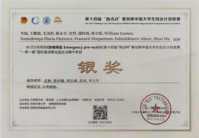 “防微预岩” 项目聚焦于安全领域。在比赛过程中,团队成员充分发挥各自专业优势,从市场调研、技术研发到商业策划,每个环节都精心打磨。李灿凭借扎实的专业知识,在项目技术核心部分发挥了关键作用;王鹏斌则利用其出色的沟通能力,积极协调团队与各方资源的对接。毛美程、陈永丰等同学在数据收集与分析、方案优化等方面也贡献了不可或缺的力量,团队成员间紧密协作,展现出强大的凝聚力与战斗力。